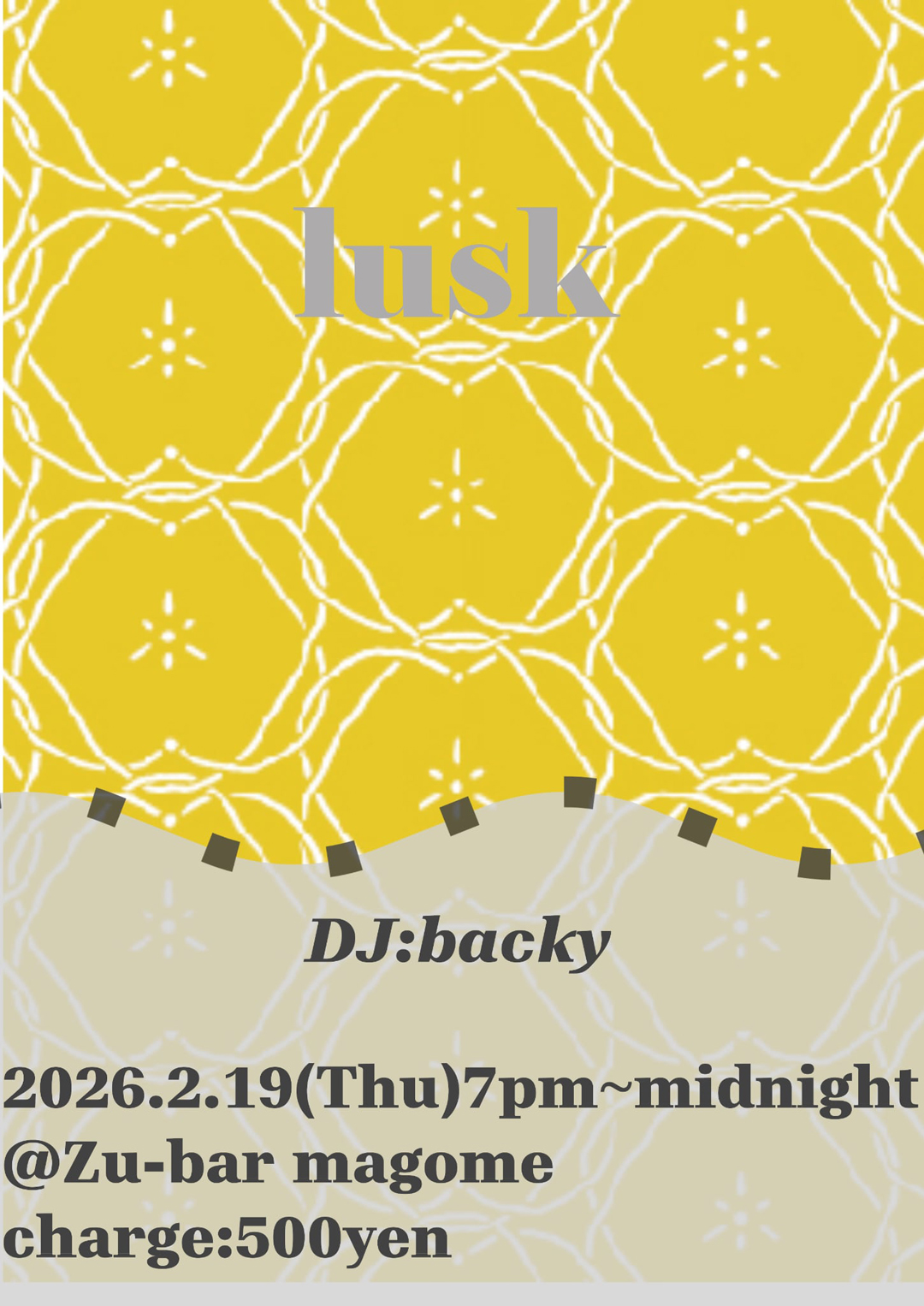 lusk 2026-02-19(Thu) 19:00-23:30 AMBIENTHOUSEPOP 2026 2.19 Thu 19:00-midnight “lusk” DJ: backy charge 500yen